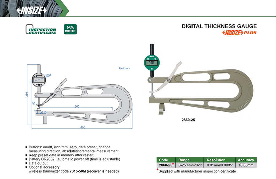 | 2860-25 | 0-25.4mm/0-1" | ±0.05mm | 0.01mm/0.0005" |
