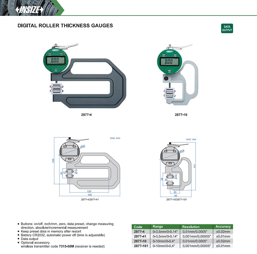 | 2877-101 | 0-10mm/0-0.4" | ±0.01mm | 0.001mm/0.00005" |