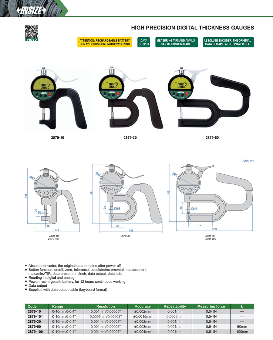| 2879-101 | 0-10mm/0-0.4" | ±0.0015mm | 0.0005mm/0.00002" |