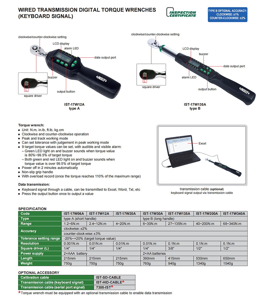 | IST-17W20A | digital | 4~20N.m | wired transmission (keyboard signal) | digital display | fixed ratchet head |