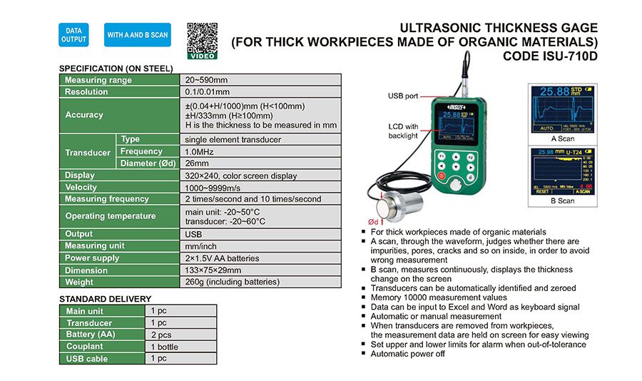 ISU-710D 20~590mm ±(0.04+H/1000)mm (H<100mm), ±H/333mm (H≥100mm) 1.0MHz USB 1000~9999m/s 26mm