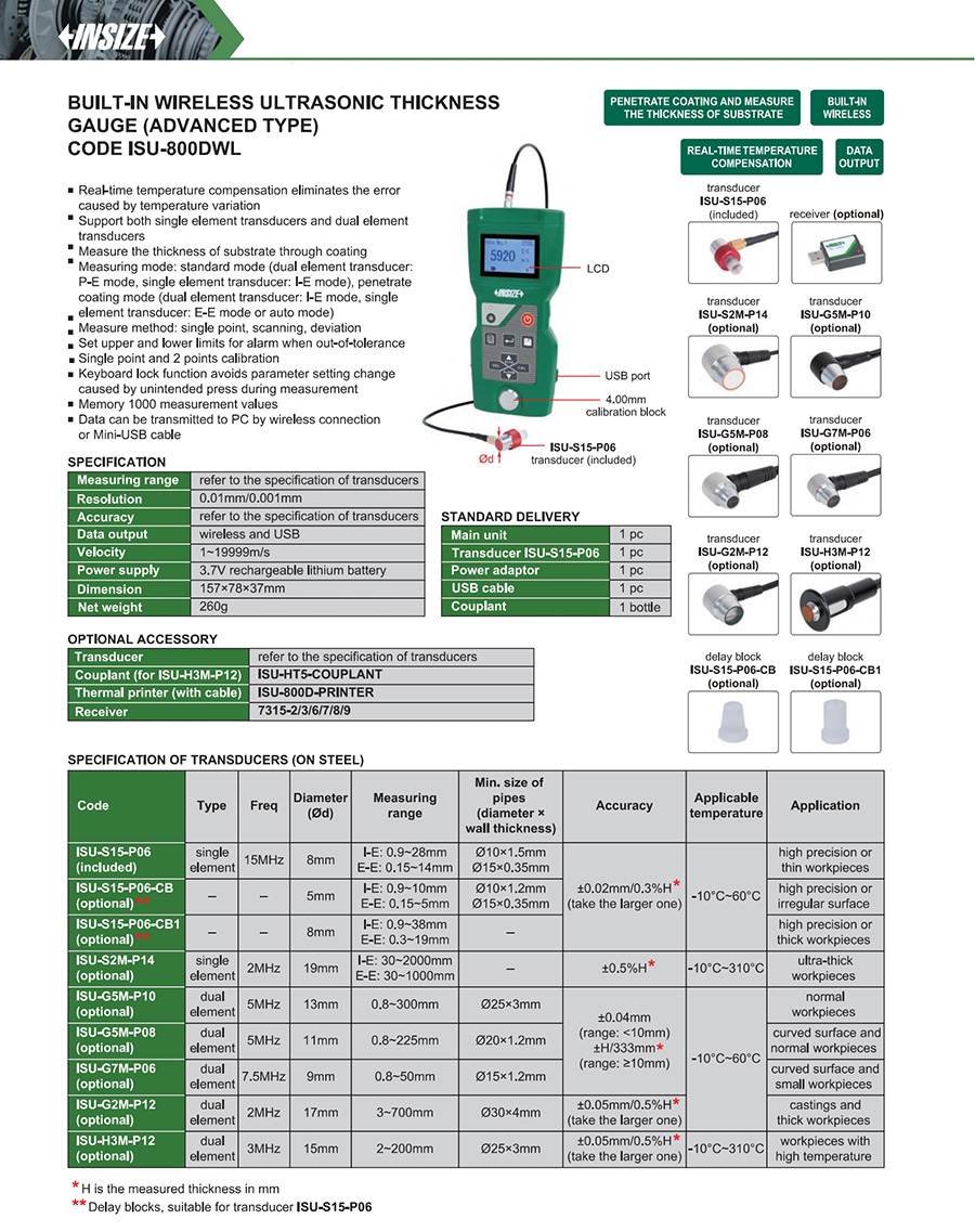 ISU-800DWL I-E: 0.9~28mm, E-E: 0.15~14mm ±0.02mm/0.3%H 15MHz wireless and USB 1~19999m/s 8mm