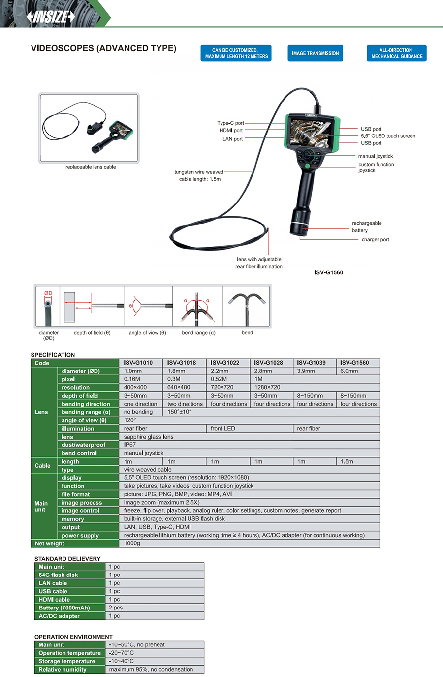 ISV-G1022 0.52M tungsten wire weaved cable front view 2.2mm 1m four directions front LED