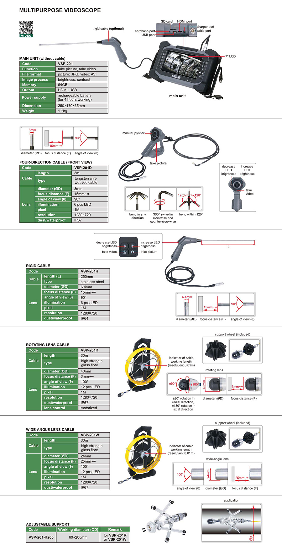 | VSP-201D | 1M | soft (tungsten wire weaved cable) | front view | 8mm | 3m | four directions | 6 pcs LED |