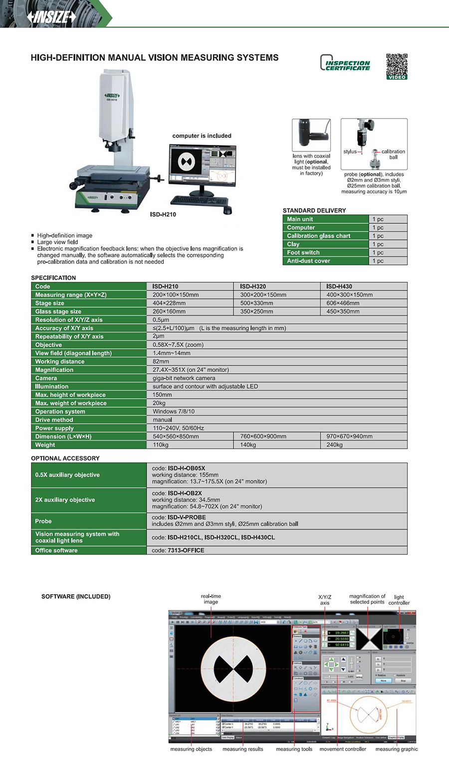 ISD-H430 400×300×150mm ≤(2.5+L/100)µm (L is the measuring length in mm) 0.5µm 2µm 27.4X~351X (on 24'' monitor) 20kg